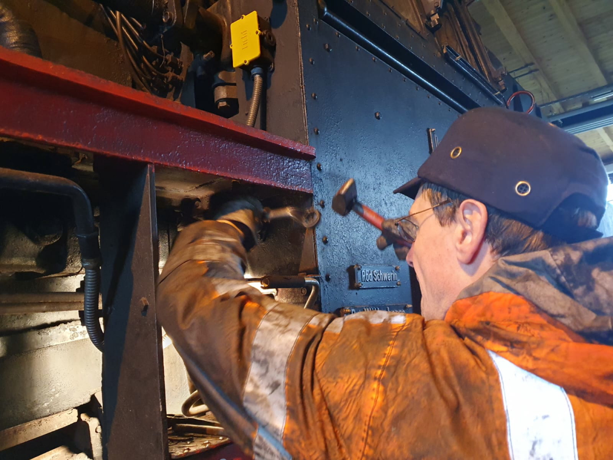 Trotz der recht kühlen Witterung gehen die Arbeiten an unseren Fahrzeugen und am Gebäude weiter. So sind einige Kleinigkeiten an unseren Dampflokomotiven zu erledigen. Im Rahmen der normalen Wartung haben wir vor einiger Zeit die Kessel ausgewaschen. Am vergangenen Wochenende wurden die sogenannten Waschlukenpilze gereinigt und wieder eingesetzt. Davon gibt es ungefähr ein bis zwei Dutzend an unterschiedlichen Stellen des Kessels, je nach Größe des Kessels. Durch diese kleinen Öffnungen werden mittels eines starken Wasserstrahls Kalkreste aus den Kesseln gespült.