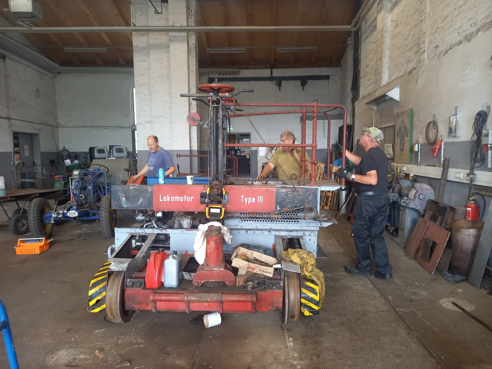 Leider brannte das Museum Mitte der 1990er Jahre nach einer Brandstiftung bis auf die Grundmauern ab, was auch den Rangiertraktor in Mitleidenschaft zog. Da es dort keine Zukunft mehr für ihn gab, übergab uns sein Eigentümer das Fahrzeug als Dauerleihgabe im Jahr 2002. Wir haben uns vor einiger Zeit dazu entschlossen, das Fahrzeug wieder betriebsfähig aufzuarbeiten und damit an den Werksgüterverkehr zu erinnern, den es auch in Wittenberge in größerem Umfang gab (z.B. Nähmaschinenwerk, Ölmühle, Gasanstalt). Was bedeutete es, das Fahrzeug „aufzuarbeiten“? Wir hatten zunächst das Dach und den Führerstand abgenommen. Nach Begutachtung des Innenlebens entschieden wir uns dazu, den Motor, Anlasser, Lichtmaschine, das Getriebe, die Kupplung, Antriebswelle, die Bremsanlage und die Achsen und Antriebsketten auszubauen. Die Teile wurden ihrerseits komplett zerlegt, gereinigt und teilweise unter Verwendung neuer oder neu angefertigter Teile wieder zusammengesetzt.