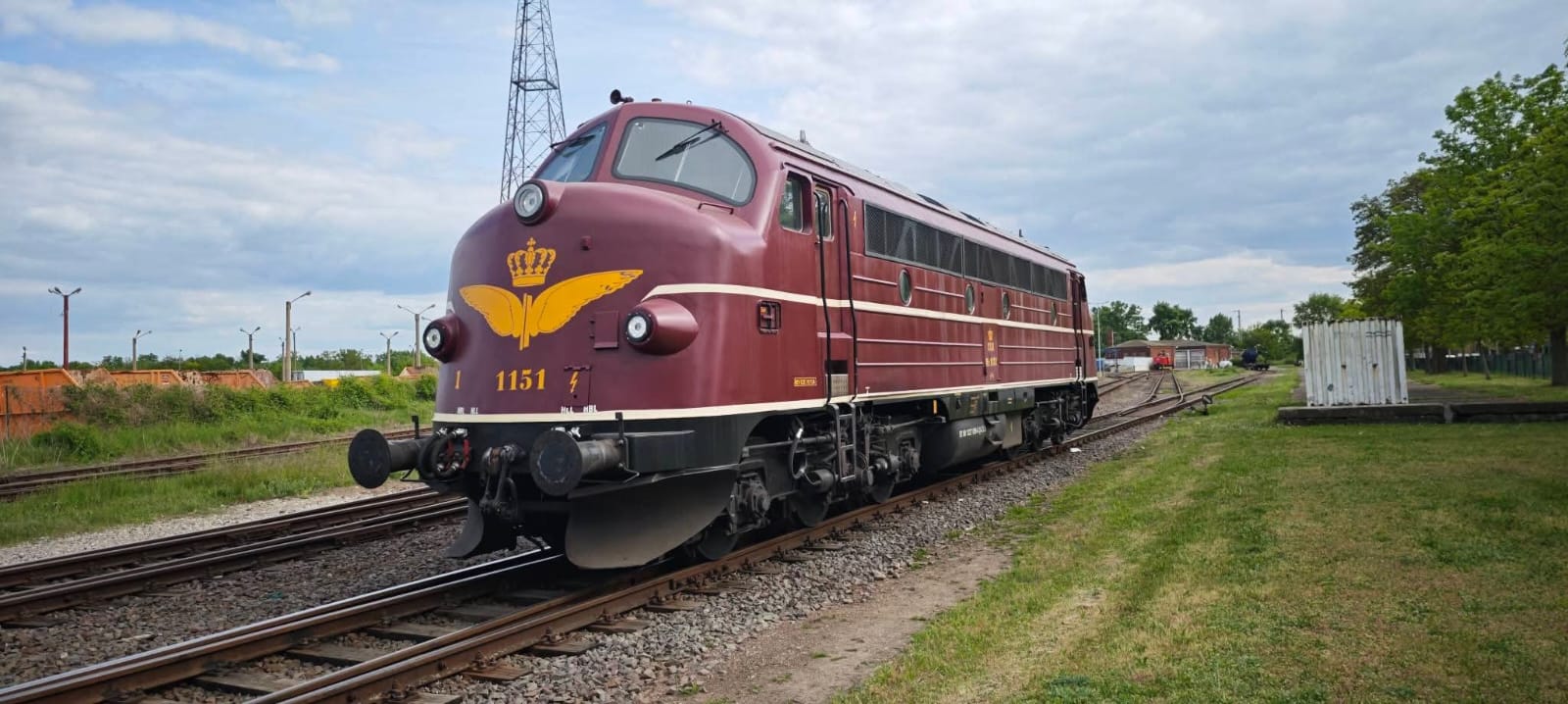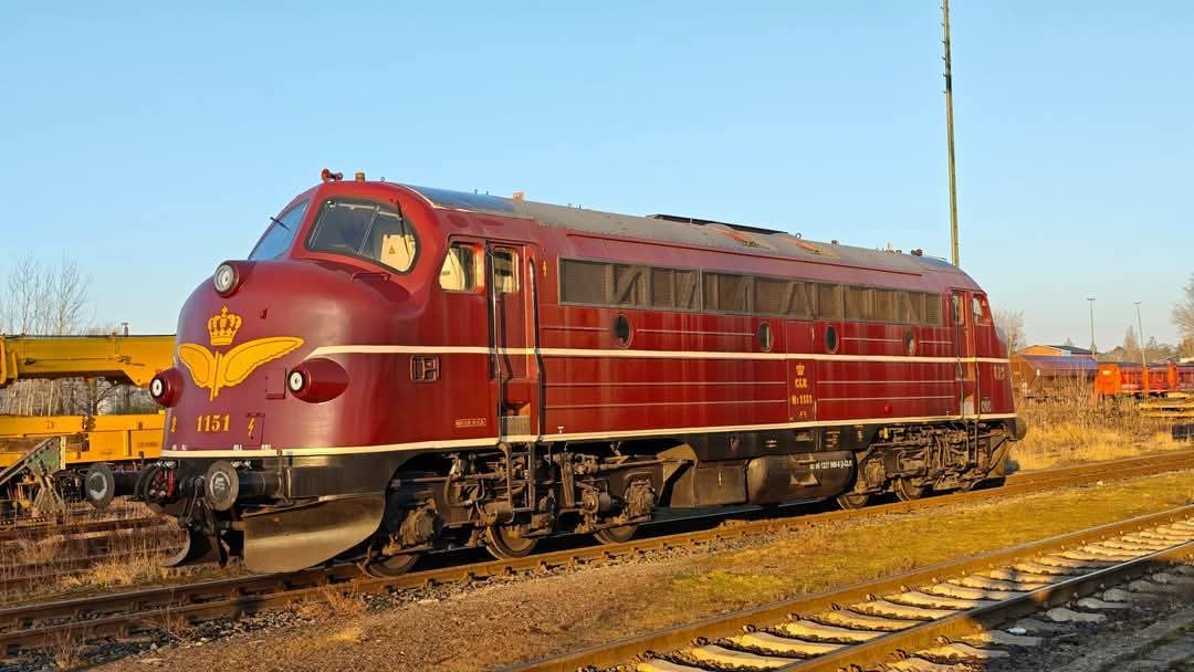 Wir freuen uns über den Besuch der Diesellok 1151, die eher eine Exotin auf deutschen Gleisen ist. Sie wurde vor 60 Jahren bei der Firma Nydqvist & Holm Aktiebolag in Trollhättan, Schweden, für die dänische Staatsbahn gebaut und lange bei unseren nördlichen Nachbarn eingesetzt. Seit 1999 war sie vorwiegend in Deutschland unterwegs. Die CLR setzt sie nun seit über zwölf Jahren vor Güter- und Bauzügen ein, wo sie sich hervorragend bewährt hat. Die Eigentümer haben sie in der ursprünglichen Farbgebung in einem dunklen rot mit goldgelben Zierelementen versehen, wie sie auch früher in Dänemark gefahren ist. So zieren zwei große Flügelrad-Symbole die Frontseiten der Lok.