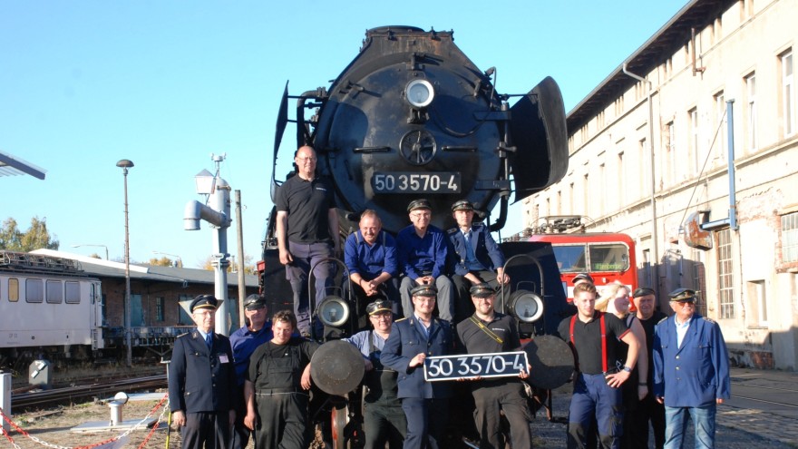 Schnell noch ein Abschiedsfoto mit einigen Vereinsmitgliedern: Bei der Dampflok 50 3570-4 steht für unabsehbare Zeit die Fahrwerks-Hauptuntersuchung an.