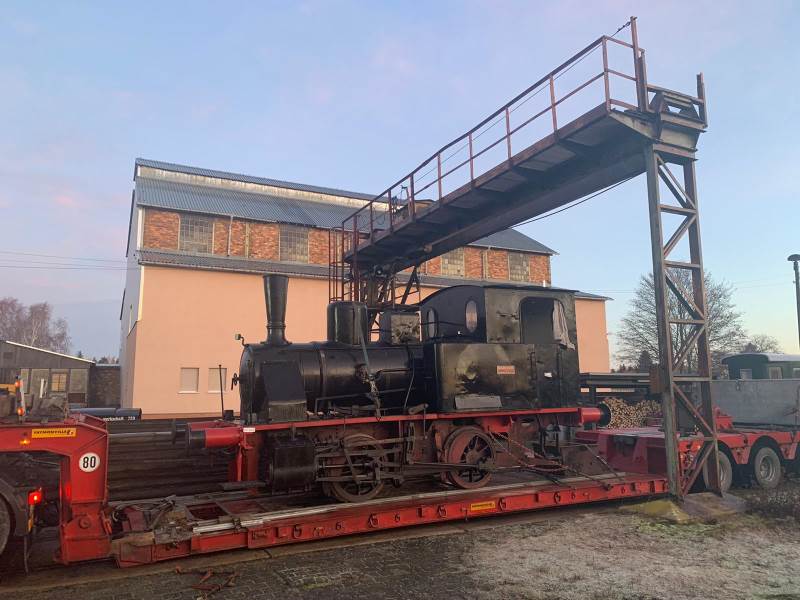 Wir berichteten Anfang April darüber, dass die ehemals für das Gaswerk in Karlsruhe gebaute Dampflok aus dem Hause Orenstein & Koppel den Weg in unser Museum gefunden hat. Die folgenden Bilder zeigen sie nach der Verladung auf einen Tieflader auf dem Weg in unser Museum und nach dem Abladen vor unserem Lokschuppen.