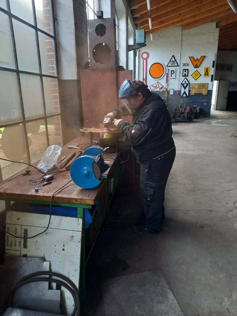 Auch am Tender für die Dampflok 50 3570 ging der unerbittliche Kampf gegen den Rost und Kalkablagerungen weiter. Heute wurde die Innenseite des Tenders von grobem Kalk befreit und die Verschlüsse der Ablaufventile gangbar gemacht. Mit ihnen kann der Wasserzulauf vom Wasserkasten des Tenders zur Lok unterbrochen werden, wenn es eine Störung an den Pumpen der Lok oder Wartungsarbeiten gibt. Die Arbeiten sind ziemlich mühsam, weil sich die Kollegen vom hintersten Ende des Tenders bis zur anderen Seite, die zur Lok zeigt, vorarbeiten müssen. Dabei mussten sie sich durch einige Aussparungen in den sogenannten Schwallblechen zwängen. Die Schwallbleche verhindern, dass das Wasser während der Fahrt ungebremst durch Tender schwappt. Die Arbeiten sind sehr unangenehm, da der Platz sehr begrenzt ist, es dunkel ist und die Geräusche stark hallen. Keine Arbeit für Menschen mit Platzangst.