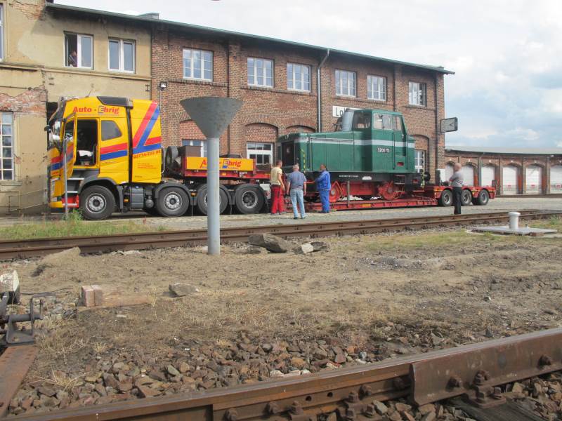 Wir freuen uns über ein neues Exponat im Historischen Lokschuppen Wittenberge. Am Freitag, den 5.8.2016 wurde die Lok des Typs S 200 per Schwertransport angeliefert. Dabei handelt es sich um eine Rangierlokomotive aus dem Hause Linke-Hoffmann-Busch, Salzgitter, die ursprünglich für die Salzgitter-Chemie GmbH geliefert wurde. Die Firma betrieb am Bahnhof Melbeck-Embsen in der Nähe von Lüneburg einen chemieverarbeitenden Betrieb. Nachdem das Werk in den 1980er Jahren geschlossen wurde, wurde die Lok an die Stärkefabrik Wietzendorf verkauft, wo sie im Verschubdienst bei der Kartoffelentladung eingesetzt wurde. Die Lok ist betriebsfähig. Sie verfügt über einen 245 PS starken Dieselmotor mit sechs Zylindern und erreicht eine Höchstgeschwindigkeit von 42 km/h.