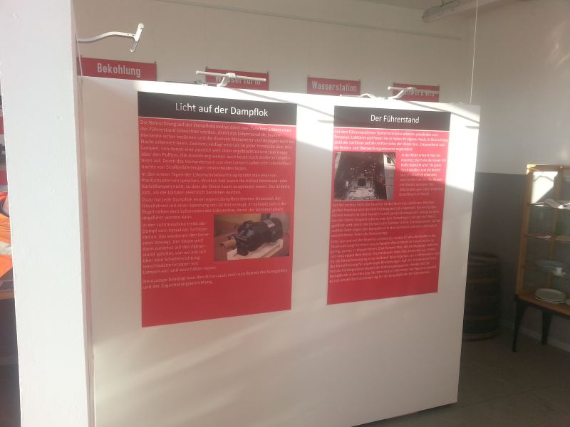 Die Winterruhe des Museums nutzen die Aktiven gewöhnlich aus, um aufwändigere Arbeiten durchzuführen. Dazu gehört zum einen die Neugestaltung unseres Ausstellungsraums im Südgiebel des Lokschuppens. Hier entsteht eine neue Ausstellung, in der die Funktionsweise der Dampflokomotive erläutert wird. Ziel ist es, die Technik zu erläutern, ohne zu technisch in den Erläuterungen zu werden. Zentrale Elemente in der Ausstellung sind neue Stellwände. Diese tragen große Plakate mit entsprechenden Erläuterungen. In der nächsten Zeit werden die um kleine Ausstellungstücke ergänzt, die aus dem Dampflokbetrieb stammen