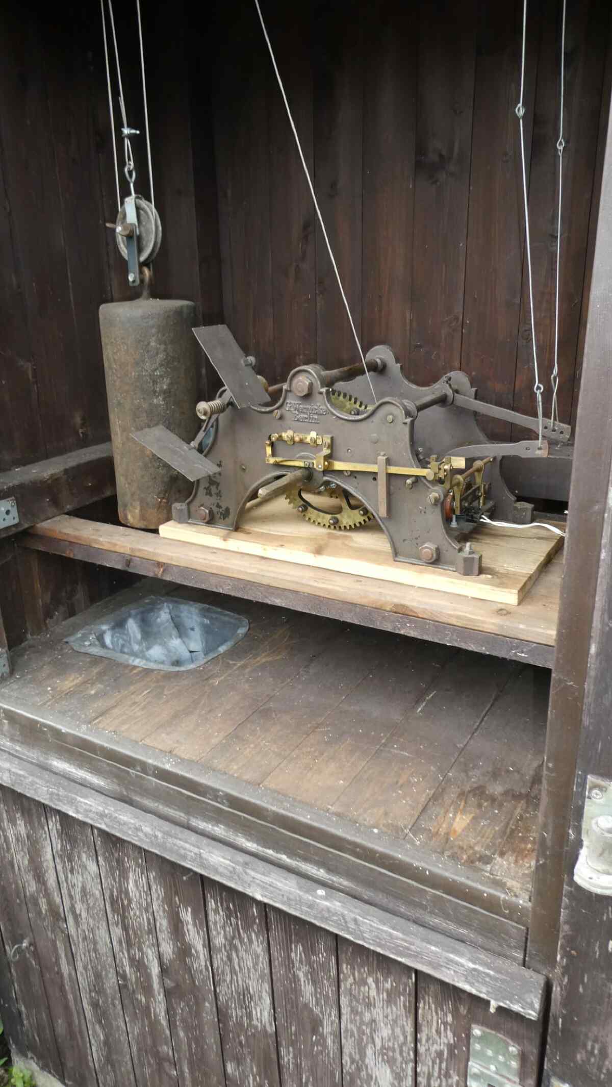 In diesen Betriebsstellen und in besagtem Büro befanden sich nun Läutewerke in unterschiedlichen Größen, die von dem Strom ausgelöst wurden. Und zwar bewirkte der Strom, dass in den Läutewerken eine Sperre gelöst und eine Art Uhrwerk aktiviert wurde, das entfernt an das einer Standuhr in der guten Stube unserer Großeltern erinnert.