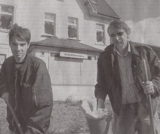 Ein Auto fährt vor und Bernd Bischoff kommt mit Eimer und Hacke um die Ecke. Nieber begrüßt ihn erfreut: "Es ist schön, dass sich wohl doch noch einige Arendseer für ihren Bahnhof interessieren."